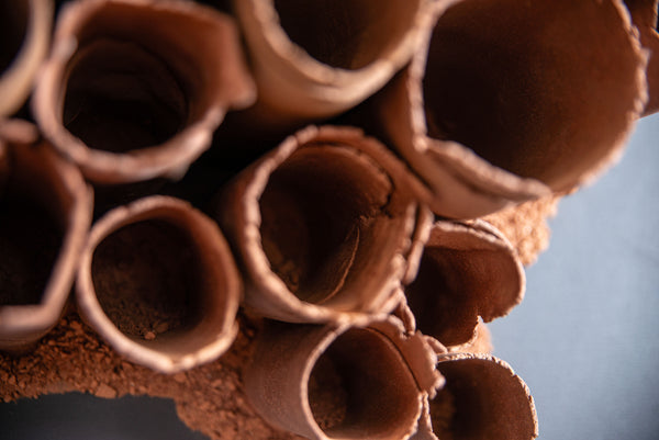 Rising eight feet high by four feet across, Ashen Song confronts the viewer with a silent chorus of unglazed ceramic vessels—each holding a pocket of darkness and a delicate drift of sand at its lip. These clustered forms echo the slow dance of volcanic ash and shifting earth, revealing matter in perpetual transition. Fire has rendered the clay enduring, yet it remains fragile, carrying the memory of raw, unformed potential.